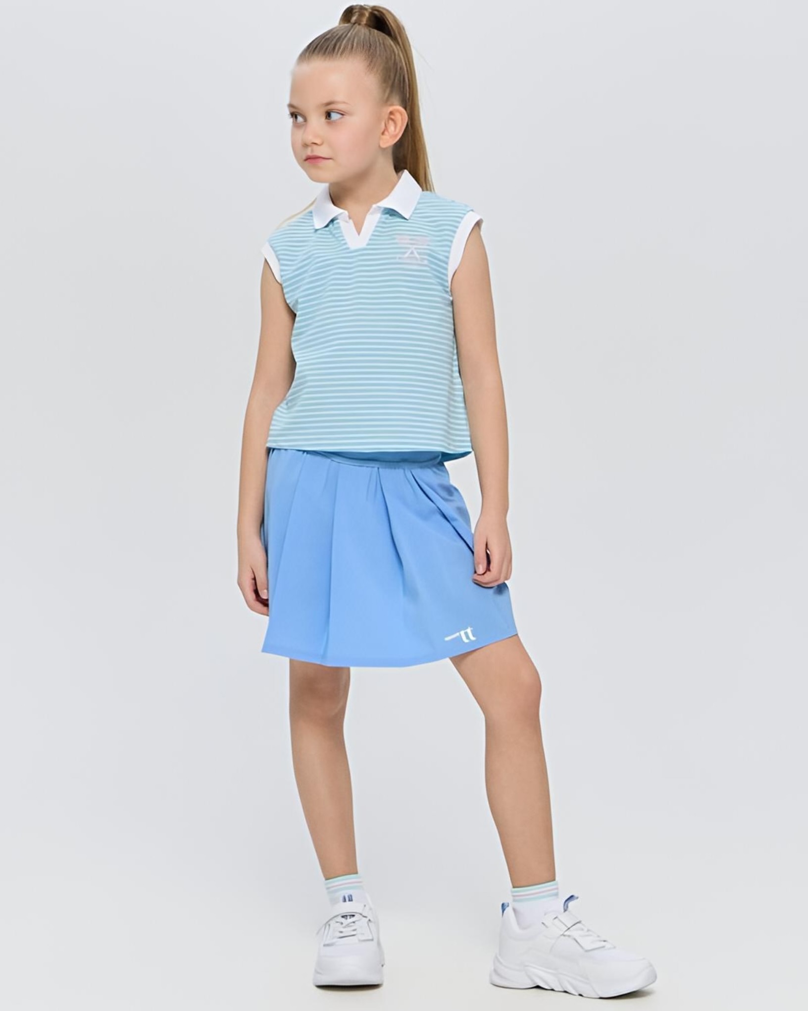 Сегодня мы хотим поделиться идеей, как создать яркий и стильный образ для вашей девочки на теннисном или падел-корте, используя палитру голубых, синих и бирюзовых оттенков.